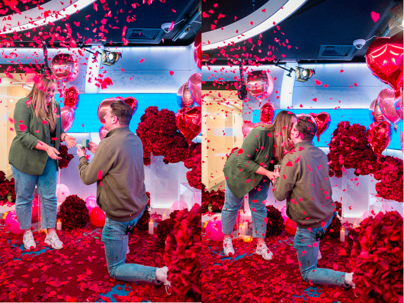 As the lift doors opened, the studio fell silent. James was waiting for her, and with the nation listening in, he got down on one knee and said: “Hi, surprise! I haven’t practised this or anything, but I’ve been keeping a secret for a few weeks now, and I’m going to ask you to marry me. Will you marry me?”